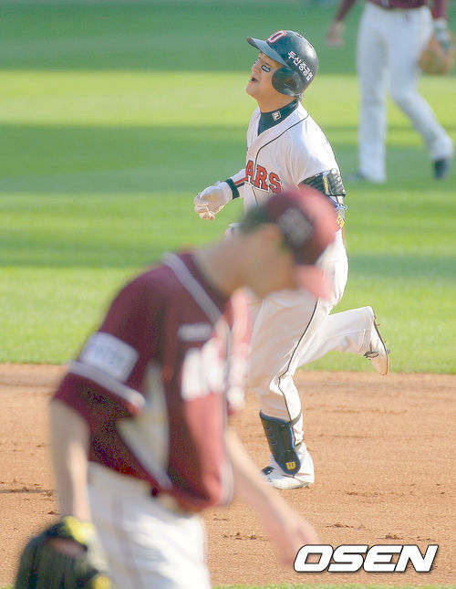 12일 오후 서울 잠실야구장에서 열린 '2013 한국야쿠르트 세븐 프로야구' 준플레이오프 4차전 두산 베어스 와 넥센 히어로즈의 경기, 6회말 1사 1루 최재훈 좌중월 역전 투런 홈런을 날리고 홈인하고 있다.
