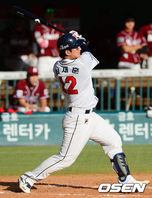12일 오후 서울 잠실구장에서 열린 '2013 한국야쿠르트 세븐 프로야구' 준플레이오프 4차전 두산 베어스와 넥센 히어로즈의 경기 6회말 1사 1루 최재훈이 투런포를 치고 있다.
