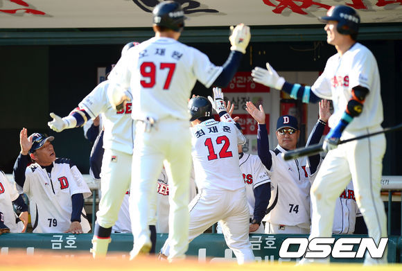12일 오후 서울 잠실구장에서 열리는 '2013 한국야쿠르트 세븐 프로야구' 준플레이오프 4차전 두산 베어스와 넥센 히어로즈의 경기 6회말 1사 1루 두산 최재훈이 넥센 밴 헤켄을 상대로 투런 홈런을 때린 뒤 기뻐하고 있다.