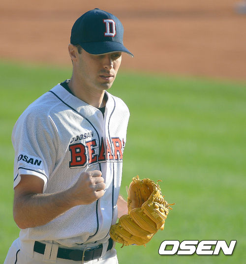 12일 오후 서울 잠실야구장에서 열린 '2013 한국야쿠르트 세븐 프로야구' 준플레이오프 4차전 두산 베어스 와 넥센 히어로즈의 경기, 7회초 2사 1,2루 두산 핸킨스가 문우람을 중견수 아웃 처리시키며 공수교대를 하며 덕아웃을 향하고 있다.