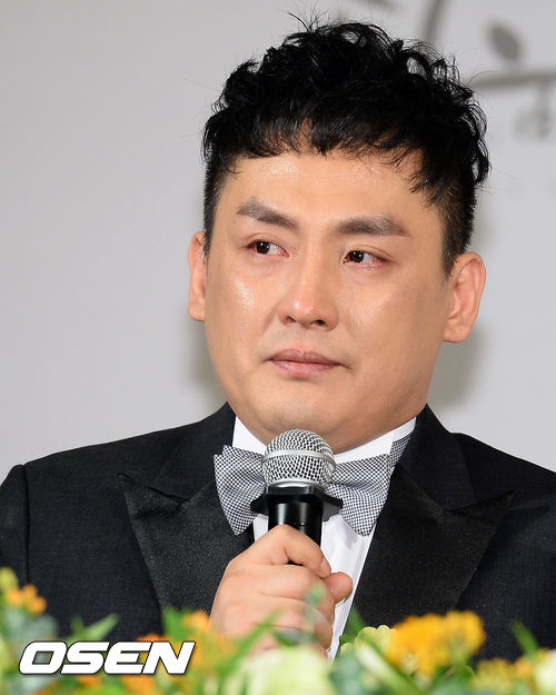 현진영이 취재진의 질문에 답을하며 눈물을 참고 있다.