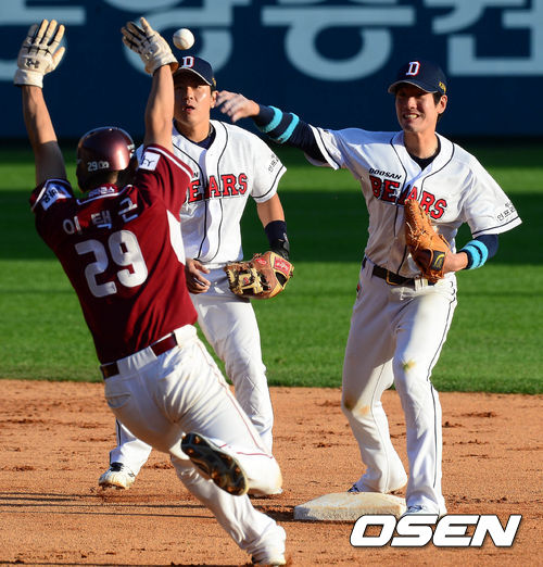 12일 오후 서울 잠실구장에서 열린 '2013 한국야쿠르트 세븐 프로야구' 준플레이오프 4차전 두산 베어스와 넥센 히어로즈의 경기 8회초 1사 1루 김민성의 병살타를 김재호가 2루에서 이택근을 포스아웃시킨 후 1루로 송구하고 있다.