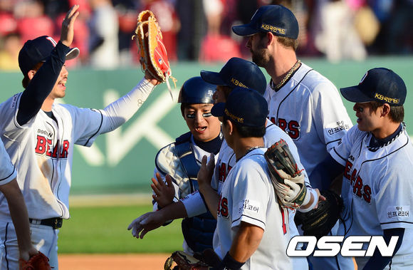 12일 오후 서울 잠실구장에서 열린 '2013 한국야쿠르트 세븐 프로야구' 준플레이오프 4차전 두산 베어스와 넥센 히어로즈의 경기 종료 후 두산 선수들이 승리를 기뻐하고 있다.
