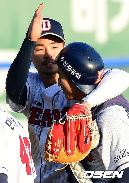 12일 오후 서울 잠실구장에서 열린 '2013 한국야쿠르트 세븐 프로야구' 준플레이오프 4차전 두산 베어스와 넥센 히어로즈의 경기 종료 후 오재원이 최재훈을 격려하고 있다.