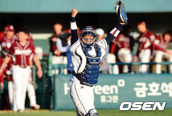 12일 오후 서울 잠실구장에서 열린 '2013 한국야쿠르트 세븐 프로야구' 준플레이오프 4차전 두산 베어스와 넥센 히어로즈의 경기 종료 후 최재훈이 두 팔을 번쩍 들며 승리를 기뻐하고 있다.