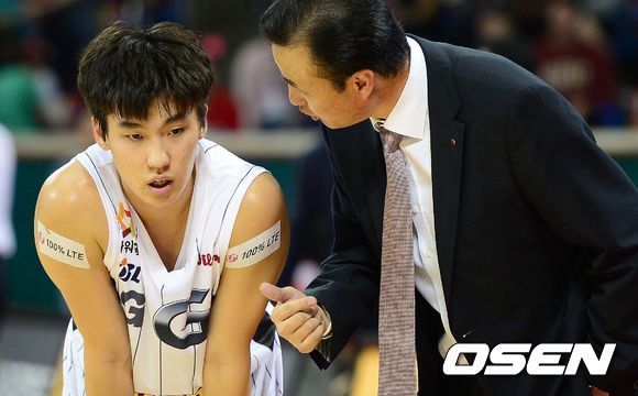 4쿼터 LG 김진 감독이 유병훈에게 작전을 지시하고 있다.