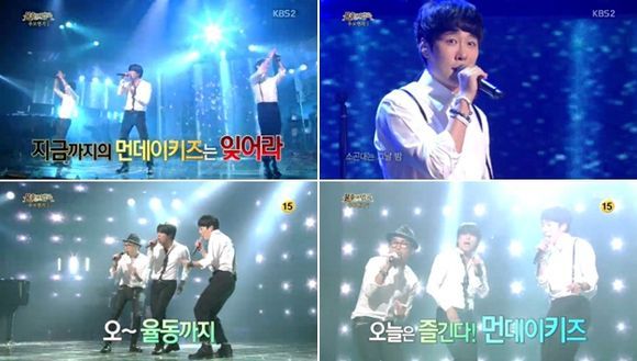 그룹 먼데이키즈가 실연의 아픔을 다룬 곡 '무너진 사랑탑'을 부르며 깜짝 퍼포먼스를 선보여 눈길을 사로잡았다.