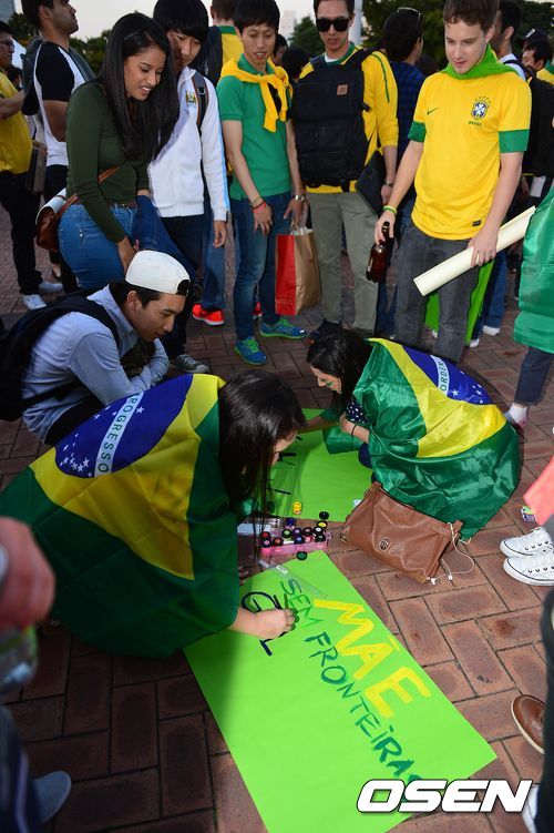 경기 시작을 앞두고 브라질 축구팬들이 응원을 준비하고 있다.
