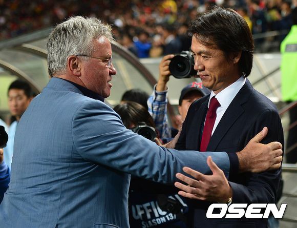 홍명보 감독과 히딩크 감독이 인사를 나누고 있다.