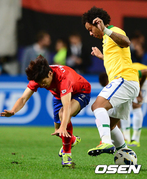 전반 한국 이청용이 브라질 마르셀루의 수비에 걸려 넘어지고 있다.