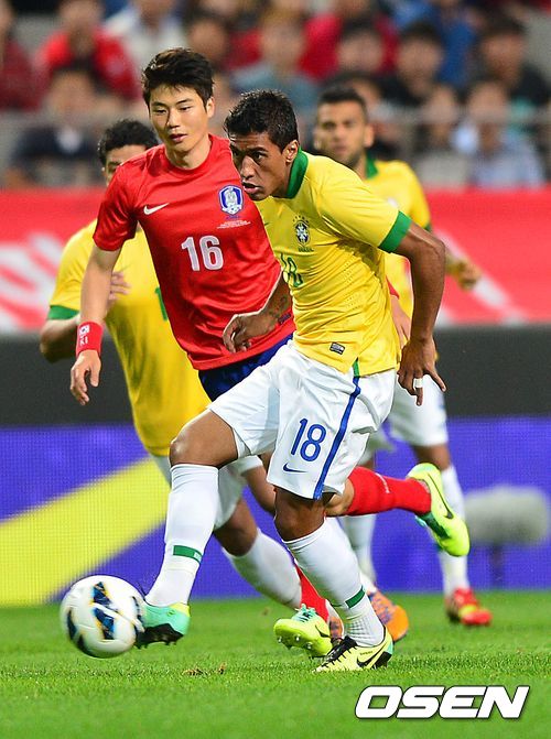 전반 브라질 파울리뉴가 한국 기성용의 수비를 피해 패스를 시도하고 있다.