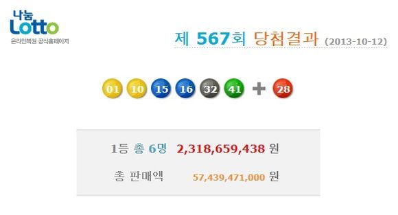 [OSEN=이슈팀] 나눔로또가 10월 12일 제567회 로또복권 추첨 결과 1등 당첨번호 1, 10, 15, 16, 32, 41이 뽑혔다고 밝혔다. 2등 보너스 번호는 28이다.