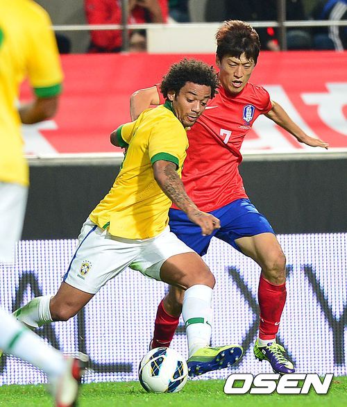 후반 한국 이청용과 브라질 마르셀루가 볼다툼을 벌이고 있다.