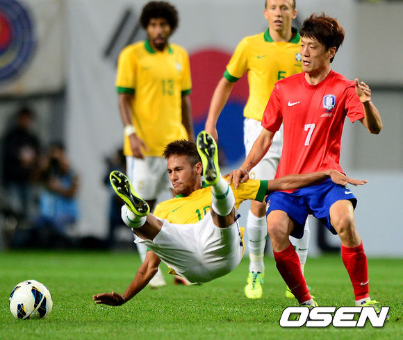 후반 한국 이청용이 브라질 네이마르에 파울을 범하고 있다.