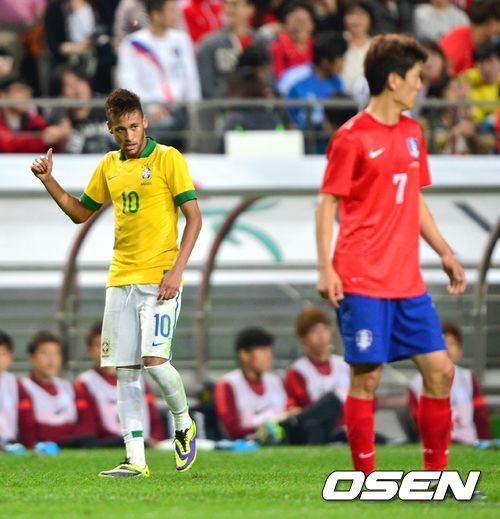 한국의 잦은 반칙은 실점으로 이어졌다. 전반 44분 박스 왼쪽에서 이용으로부터 반칙을 얻어낸 네이마르는 자신이 직접 키커로 나서 슈팅을 시도했다. 가볍게 찬 네이마르는 수비진의 벽을 넘어 가까운 포스트를 향했고, 정확하게 구석을 노린 슈팅에 골키퍼 정성룡은 몸을 날렸지만 골문을 지켜내지 못했다.
