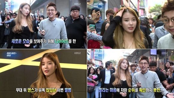 아이유는 12일 방송된 KBS 2TV 예능 프로그램 '연예가중계'에서 "컴백 앞두고 가장 신경을 쓴 건 다이어트였다"며 "드라마 촬영을 하면서 살이 많이 쪘다. 가수로 컴백할 때 다른 모습 보이려고 다이어트에 신경을 많이 썼다"고 말했다.