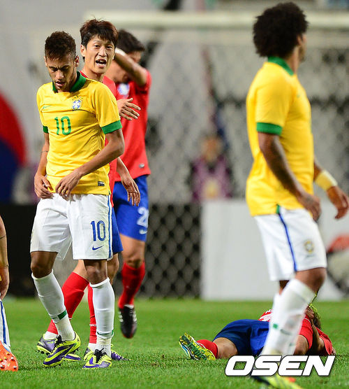 전반 브라질 네이마르가 한국 한국영에 파울을 범하자 이청용이 네이마르에 불만을 나타내고 있다./jpnews@osen.co.kr