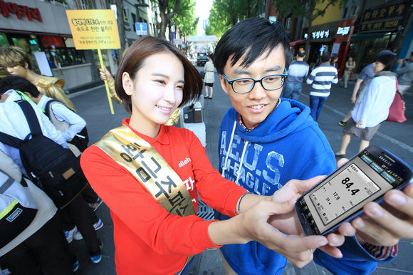 서울 종로구 인사동 일대에서 ‘광대역 LTE-A 한판대결’ 이벤트를 진행 중인 KT 속도체험단 및 참여자들이 KT의 ‘광대역 LTE-A’가 제공하는 네트워크 서비스의 속도를 측정하고 있는 모습.
