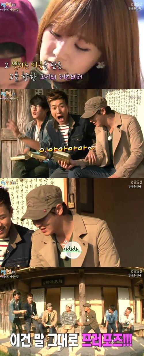 13일 방송된 KBS 2TV 예능프로그램 '해피선데이-1박2일'(이하 '1박2일')에서는 '여심 따라 가을 여행' 특집을 맞아 홍성으로 여행을 떠난 멤버(유해진, 엄태웅, 차태현, 이수근, 성시경, 김종민, 주원)의 모습이 그려졌다.