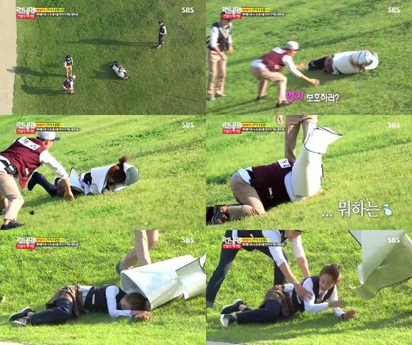개리는 13일 오후 방송된 SBS 예능프로그램 '일요일이 좋다-런닝맨(이하 '런닝맨')'에서 언덕을 굴러 내려오는 송지효를 보호하기 위해 껴안아 눈길을 끌었다.