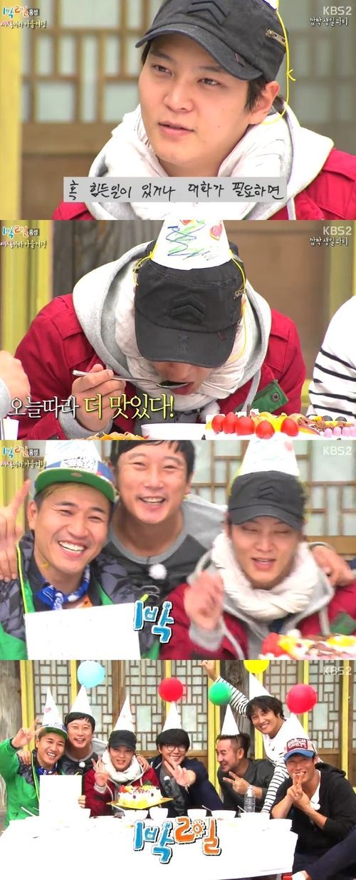 주원은 13일 방송된 KBS 2TV 주말 버라이어티 '해피선데이-1박2일'에서 김종민과 함께 생일상을 받았다. 녹화일(9월 28일)이 주원과 김종민의 생일(9월 30일) 이틀 전이었던 만큼 나머지 멤버들이 깜짝 생일 파티를 준비한 것.