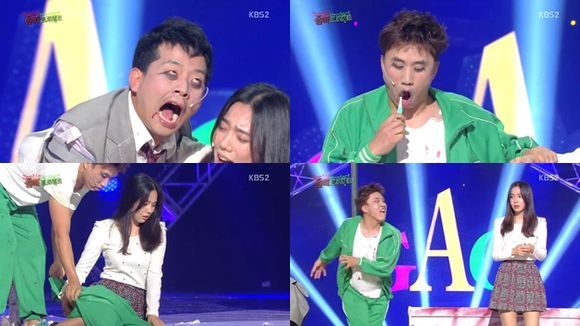 이에 김준호 대신 김나희를 공격하려던 정태호는 “안돼”라는 김나희의 비명에 양치질을 하고. 치마를 입은 채 넘어진 김나희에게 상의를 벗어 덮어주는 매너좋은 모습을 선보여 여성방청객들의 환호성을 자아냈다.