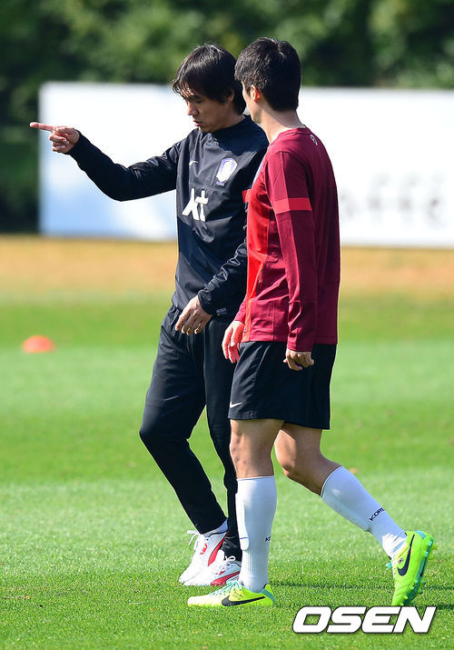 홍명보 감독이 기성용에게 훈련을 지시하고 있다.