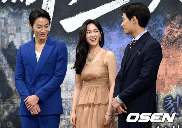 14일 오후 서울 논현동 이피리얼 팰리스 호텔 셀레나홀에서 진행된 tvN '빠스껫 볼' 제작발표회에서 정동현 이엘리야 도지한이 포토타임을 갖고 있다.