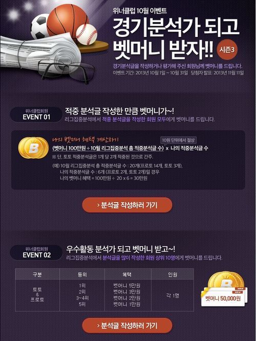 위너클럽 ‘리그집중분석’ 코너에서 토토, 프로토 적중 및 분석글 작성 이벤트