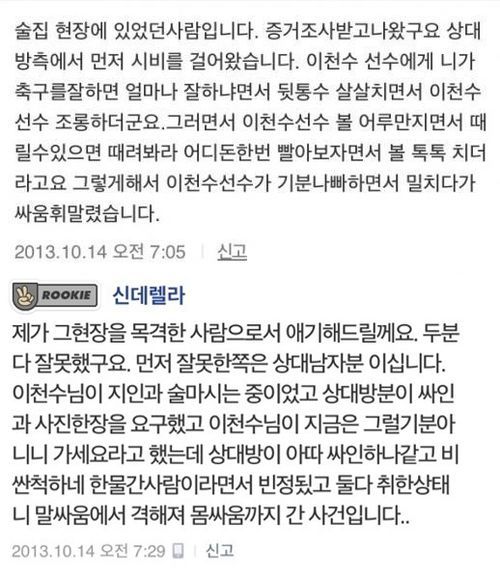 "제가 그 현장을 목격한 사람으로서 얘기해드릴게요"라고 쓴 또 다른 목격자는 "두 분 다 잘못했구요. 먼저 잘못한 쪽은 상대 남자분이십니다. 이천수님이 지인과 술 마시는 중이었고 상대방 분이 사인과 사진 한 장을 요구했고 이천수님이 지금은 그럴 기분이 아니니 가세요 라고 했는데 상대방이 아따 사인 하나 가지고 비싼 척 하네 한물간 사람이라면서 빈정댔고 둘다 취한 상태니 말싸움에서 격해져 몸싸움까지 간 사건입니다"라고 썼다.