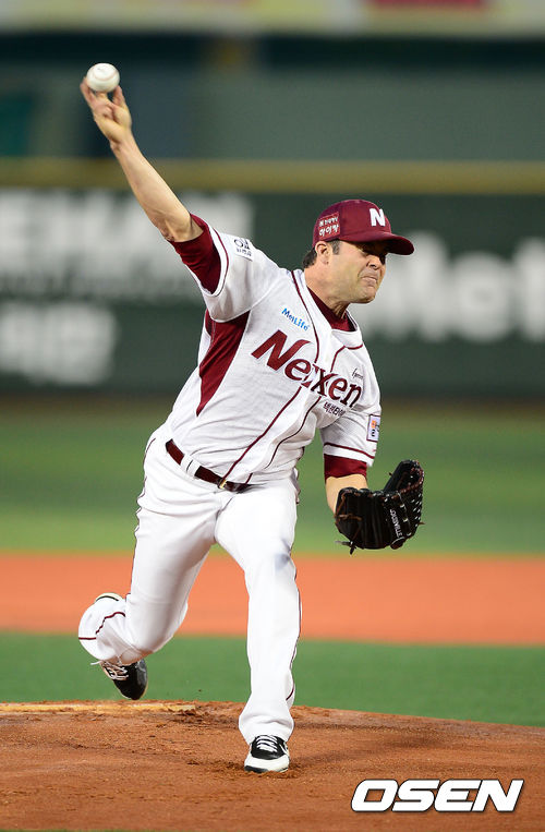 14일 오후 서울 목동구장에서 열린 '2013 한국야쿠르트 세븐 프로야구' 준플레이오프 5차전 넥센 히어로즈와 두산 베어즈의 경기, 1회초 넥센 나이트가 역투하고 있다.