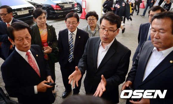14일 오후 서울 목동구장에서 열린 '2013 한국야쿠르트 세븐 프로야구' 준플레이오프 5차전 넥센 히어로즈와 두산 베어스의 경기 시작전 창원시의회 관계자들이 KBO에 항의서한을 전달하기위해 목동구장을 찾았지만 출입이 거부되자 항의를 하고 있다.