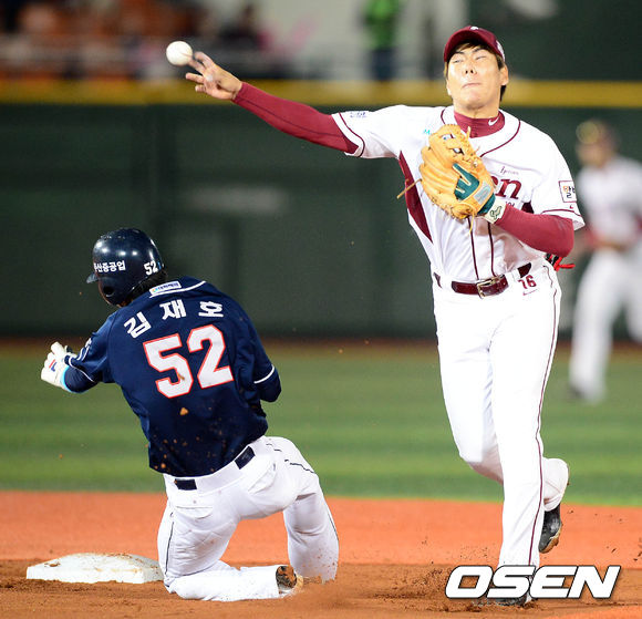 14일 오후 서울 목동구장에서 열린 '2013 한국야쿠르트 세븐 프로야구' 준플레이오프 5차전 넥센 히어로즈와 두산 베어스의 경기 3회초 1사 1,2루 이종욱의 2루수앞 땅볼 상황, 강정호가 2루에서 김재호를 포스아웃 시킨 후 1루로 송구하고 있다. 1루에서는 세이프.