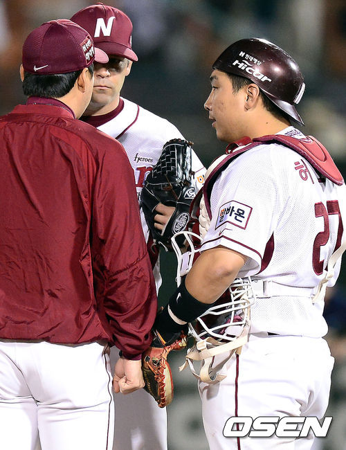 14일 오후 서울 목동구장에서 열린 '2013 한국야쿠르트 세븐 프로야구' 준플레이오프 5차전 넥센 히어로즈와 두산 베어즈의 경기, 3회초 1사 1,2루 넥센 나이트가 연속 안타를 허용하자 허도환이 마운드에 올라 이야기를 나누고 있다.