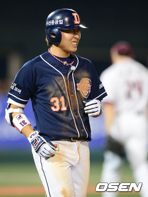 14일 오후 서울 목동구장에서 열린 '2013 한국야쿠르트 세븐 프로야구' 준플레이오프 5차전 넥센 히어로즈와 두산 베어스의 경기 3회초 2사 1,3루 정수빈이 투수 땅볼로 물러나자 아쉬운 표정을 짓고 있다.
