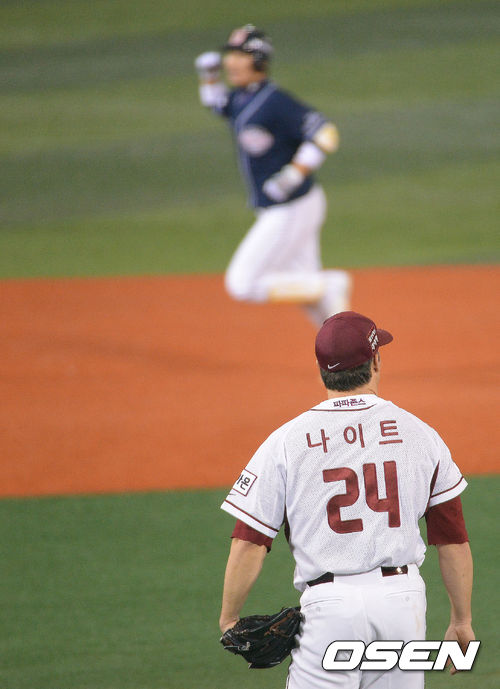 14일 오후 서울 목동야구장에서 열린 '2013 한국야쿠르트 세븐 프로야구' 준플레이오프 5차전 넥센 히어로즈 와 두산 베어스의 경기, 4회초 1사 1,2루 넥센 선박 나이트가 이원석에게 좌월 스리런 홈런을 허용하며 아쉬워하고 있다.