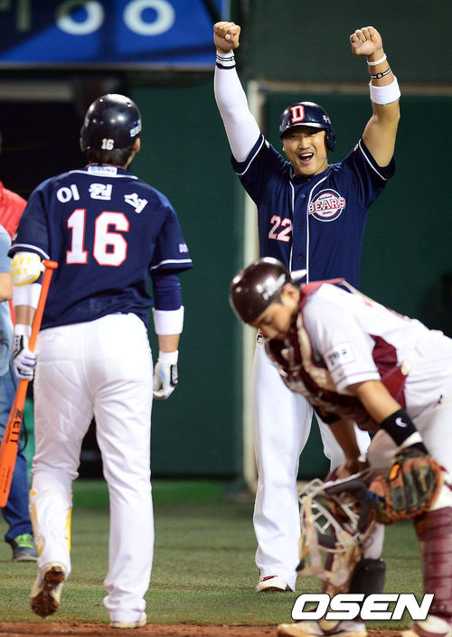 14일 오후 서울 목동구장에서 열린 '2013 한국야쿠르트 세븐 프로야구' 준플레이오프 5차전 넥센 히어로즈와 두산 베어즈의 경기, 4회초 1사 1,2루 두산 이원석이 좌측 담장을 넘기는 스리런 홈런을 때린 뒤 기뻐하고 있다.