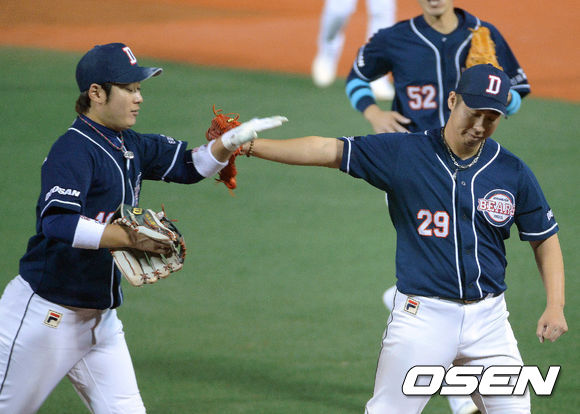 14일 오후 서울 목동야구장에서 열린 '2013 한국야쿠르트 세븐 프로야구' 준플레이오프 5차전 넥센 히어로즈 와 두산 베어스의 경기, 4회 수비를 마친 두산 유희관이 덕아웃을 향하며 이원석과 파이팅을 하고 있다.
