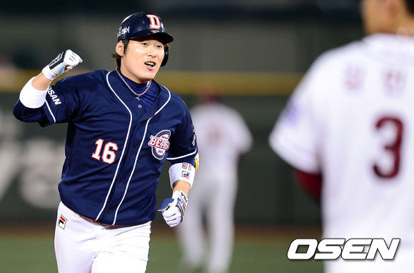 14일 오후 서울 목동구장에서 열린 '2013 한국야쿠르트 세븐 프로야구' 준플레이오프 5차전 넥센 히어로즈와 두산 베어즈의 경기, 4회초 1사 1,2루 두산 이원석이 좌측 담장을 넘기는 스리런 홈런을 때린 뒤 기뻐하고 있다.