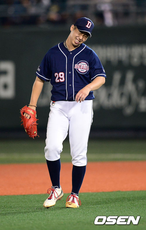 14일 오후 서울 목동구장에서 열린 '2013 한국야쿠르트 세븐 프로야구' 준플레이오프 5차전 넥센 히어로즈와 두산 베어즈의 경기, 8회말 무사 1루 두산 유희관이 넥센 김민성에게 안타를 허용하자 아쉬워하고 있다.