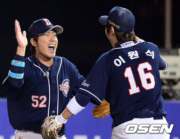 14일 오후 서울 목동구장에서 열린 '2013 한국야쿠르트 세븐 프로야구' 준플레이오프 5차전 넥센 히어로즈와 두산 베어즈의 경기, 8회말 1사 1,3루 두산 김재호와 이원석이 실점위기를 병살로 막아낸 뒤 기뻐하고 있다.