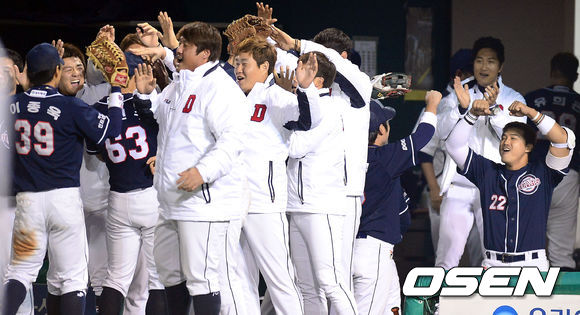 14일 오후 서울 목동구장에서 열린 '2013 한국야쿠르트 세븐 프로야구' 준플레이오프 5차전 넥센 히어로즈와 두산 베어즈의 경기, 8회말 두산 선수들이 실점 위기를 넘기고 기뻐하고 있다.