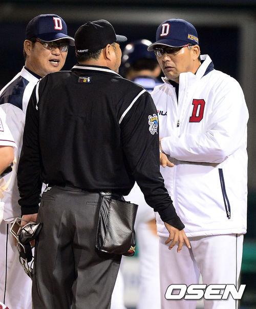 14일 오후 서울 목동구장에서 열린 '2013 한국야쿠르트 세븐 프로야구' 준플레이오프 5차전 넥센 히어로즈와 두산 베어즈의 경기, 9회초 1사 1,3루 오재원의 1루수앞 땅볼에 홈으로 쇄도하던 3루주자 허경민이 홈에서 아웃당하자 두산 김진욱 감독이 주심에게 어필하고 있다.