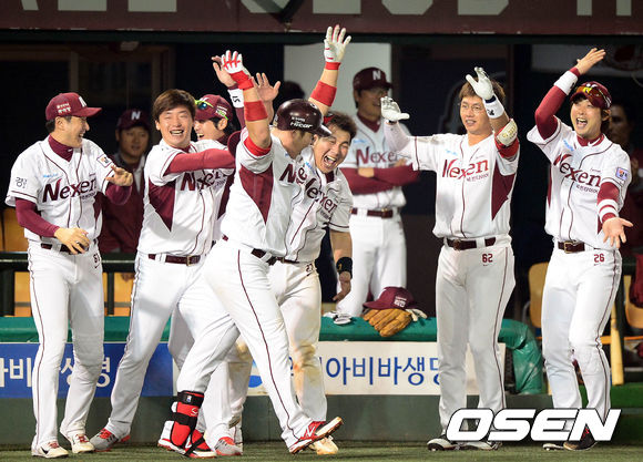 14일 오후 서울 목동구장에서 열린 '2013 한국야쿠르트 세븐 프로야구' 준플레이오프 5차전 넥센 히어로즈와 두산 베어스의 경기 9회말 2사 1,2루 박병호가 스리런포를 치고 덕아웃에서 동료들과 하이파이브를 하고 있다.