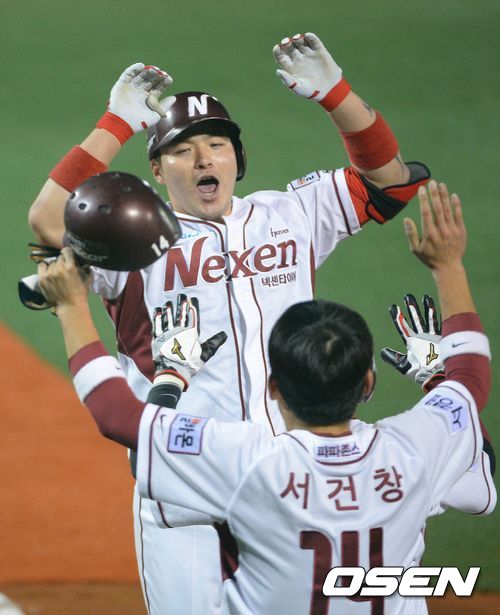 14일 오후 서울 목동야구장에서 열린 '2013 한국야쿠르트 세븐 프로야구' 준플레이오프 5차전 넥센 히어로즈 와 두산 베어스의 경기,9회말 2사 1,2루 박병호 중월 스리런 홈런을 날리고 동료들의 환영을 받고 있다.