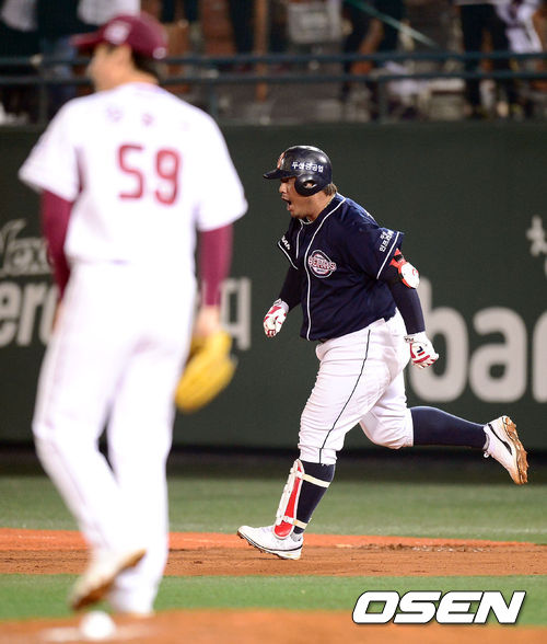 14일 오후 서울 목동구장에서 열린 '2013 한국야쿠르트 세븐 프로야구' 준플레이오프 5차전 넥센 히어로즈와 두산 베어즈의 경기, 연장 13회초 무사 두산 최준석이 넥센 강윤구를 상대로 역전 솔로 홈런을 때린 뒤 기뻐하고 있다.