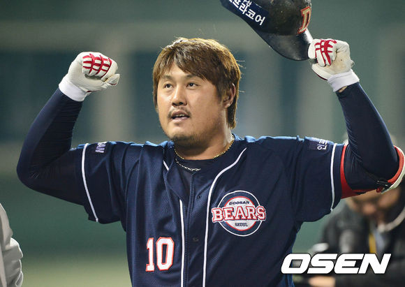 14일 오후 서울 목동구장에서 열린 '2013 한국야쿠르트 세븐 프로야구' 준플레이오프 5차전 넥센 히어로즈와 두산 베어스의 경기 13회초 선두타자 최준석이 솔로포를 치고 덕아웃에서 기뻐하고 있다.