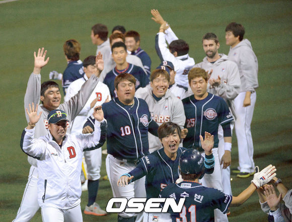 14일 오후 서울 목동야구장에서 열린 '2013 한국야쿠르트 세븐 프로야구' 준플레이오프 5차전 넥센 히어로즈 와 두산 베어스의 경기, 연장 13회초 무사 2루 민병헌의 적시타때 2루 주자 정수빈 득점을 올리며 덕아웃 동료들의 환영을 받고 있다.