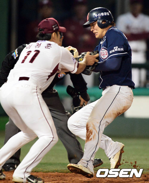 14일 오후 서울 목동구장에서 열린 '2013 한국야쿠르트 세븐 프로야구' 준플레이오프 5차전 넥센 히어로즈와 두산 베어스의 경기 13회초 1사 3루 홍성흔의 3루수앞 땅볼 상황, 홈으로 쇄도하던 3루주자 민병헌이 태그아웃당하고 있다.