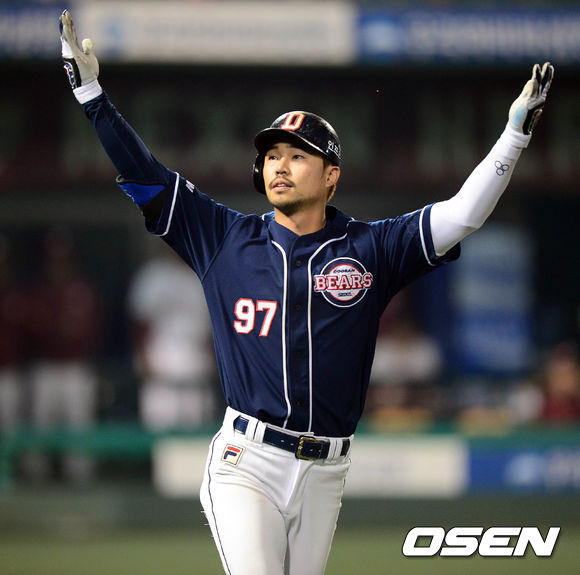 14일 오후 서울 목동구장에서 열린 '2013 한국야쿠르트 세븐 프로야구' 준플레이오프 5차전 넥센 히어로즈와 두산 베어스의 경기 13회초 2사 1,2루 오재원이 스리런포를 치고 환호하고 있다.